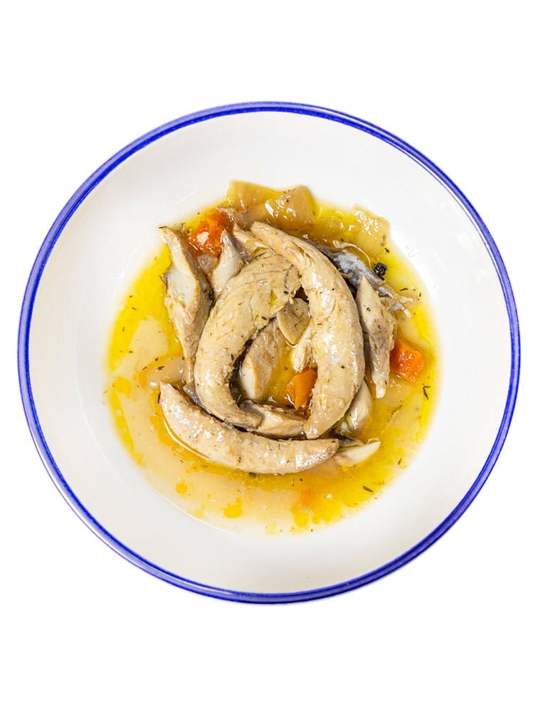 1 de diciembre de 2025Verdel o Caballa del Mar Cantábrico pescado con anzuelo y cocinado da a baja temperatura en su propio jugo. Se presenta acompañado de un escabeche tradicional con su verdura y especias.